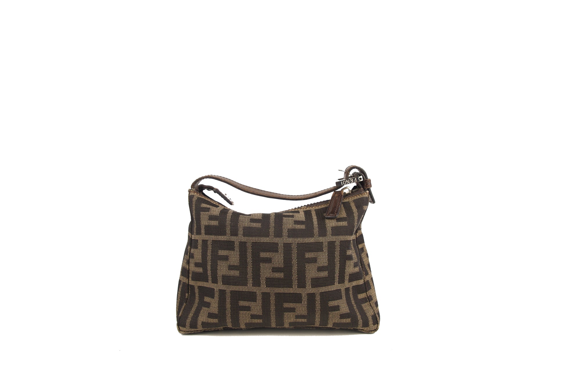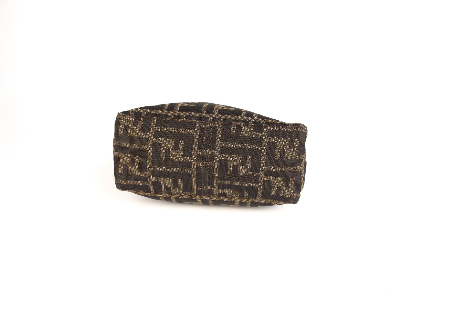 Whether you wear it as a statement mini bag for evenings or use it as a chic pouch for your daily essentials, this piece delivers versatility and vintage charm in one. Crafted from the iconic FF monogram canvas with dark brown leather accent.