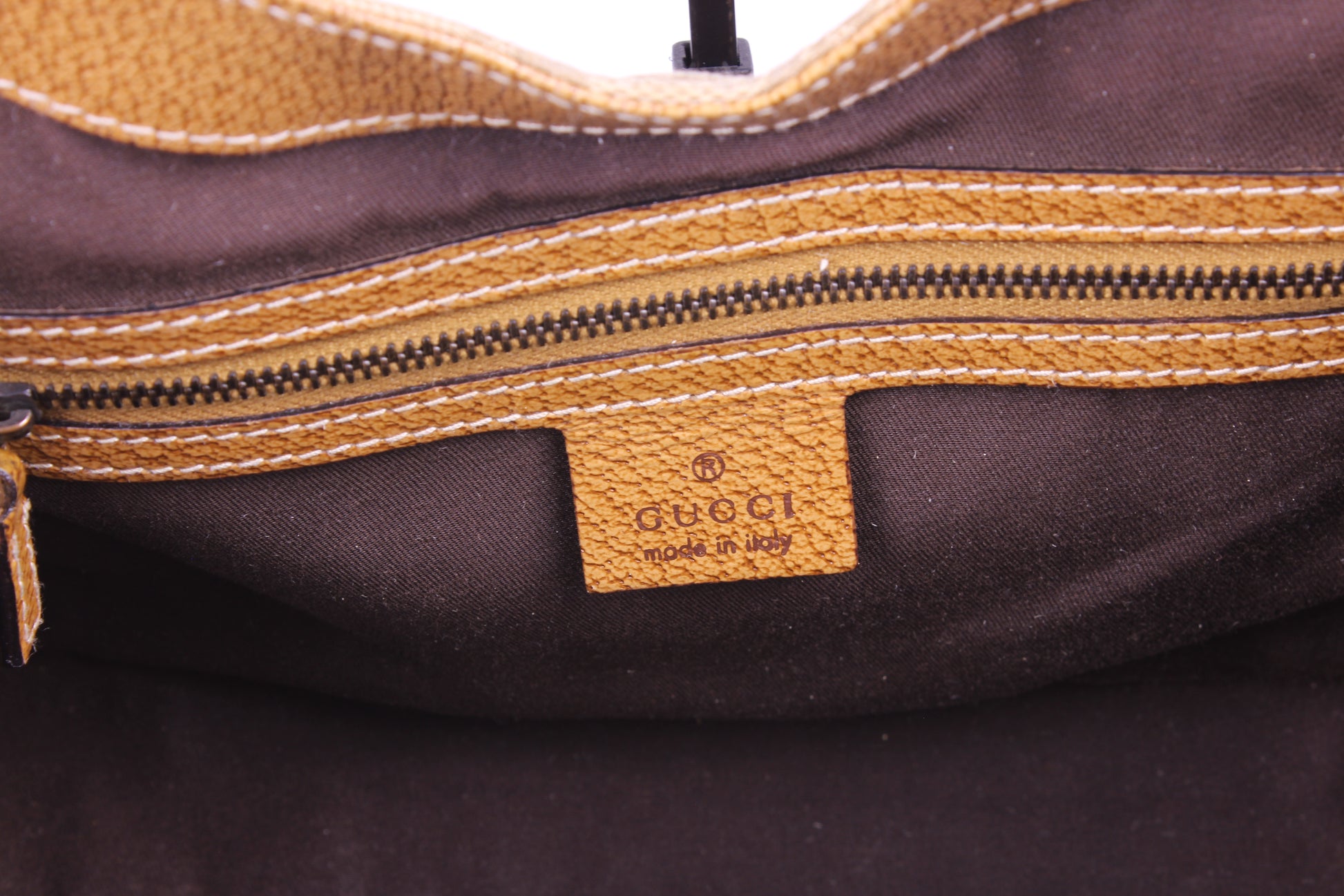 Features: Crafted from Gucci’s monogram canvas with brown leather trim, featuring a signature piston-lock closure and one inner pocket.